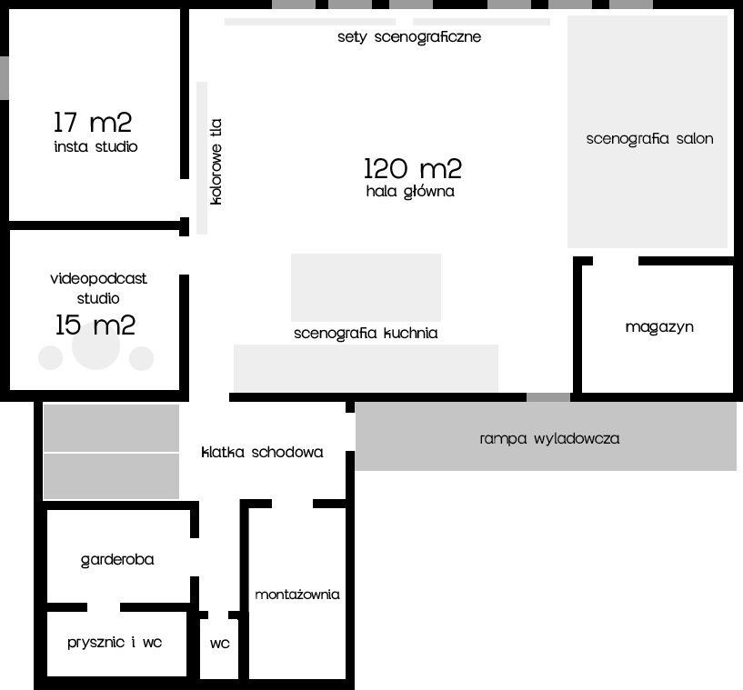 Scenografie domowe takie jak salon, kuchnia, łazienka, tła, studio podcastowe, studio do nagrań rolek i wiele więcej możliwości.